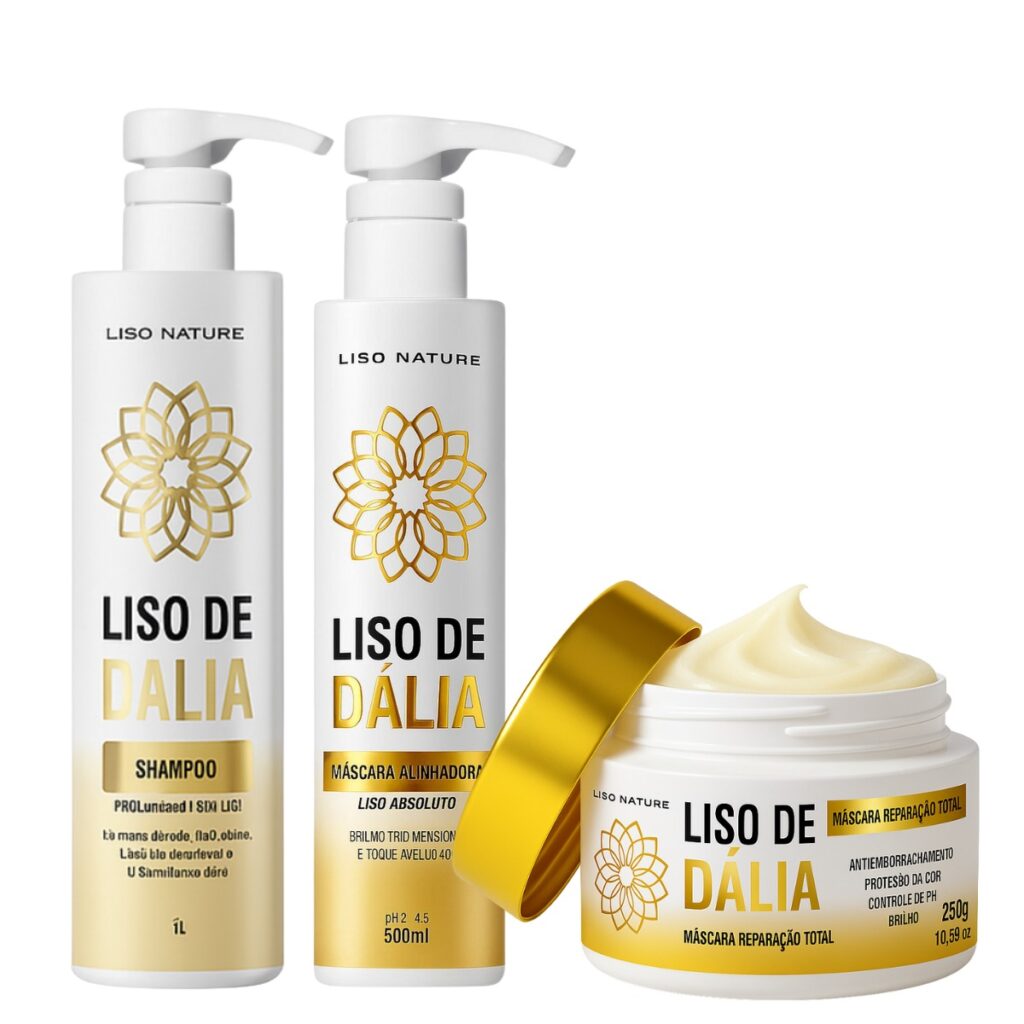 Com o Liso de Dália, você pode desfrutar de cabelos lisos e brilhosos todos os dias sem precisar recorrer a ferramentas de calor após a aplicação do produto. Nossa fórmula exclusiva e poderosa garante resultados incríveis, mesmo após a lavagem dos cabelos, sem a necessidade de retoques diários com ferramentas de calor.”